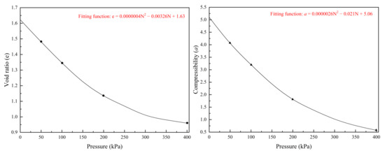 Selecting the average values of the void ratio and compressibility in the left, middle, and right boreholes of section K41+277 under equal load action, as listed in Table 4, the least-squares method was applied to fit quadratic curves, as shown in Figure 9.
