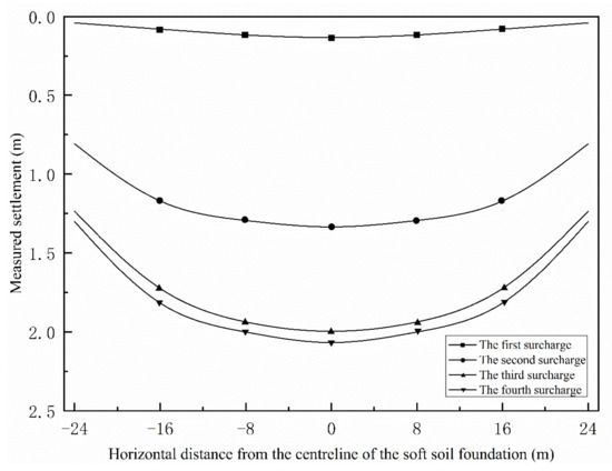 - The PVD spacing for the expressway in southern China was 1.2-1.5m, the influence range of a single PVD was 15 m [35,36], the measured settlement curve of the soft soil foundation in the coastal area of South China cross-section and the settlement curve obtained with the PVD model looked similar to quadratic functions that were convex upward, and the maximum value occurs at the center line of the cross-section. The settlement is highest at the center line of the foundation because the horizontal confinement of the soil is the greatest at this point.