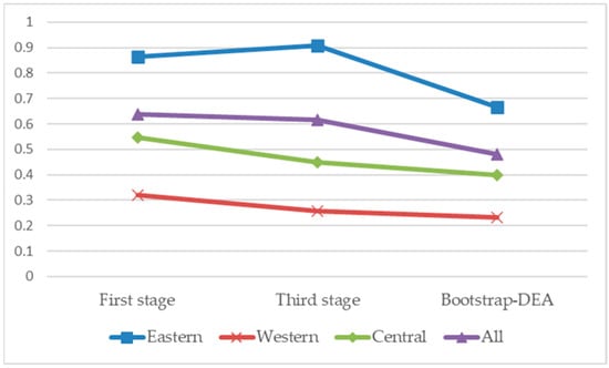35] to further revise the three-stage DEA results. This method avoids the problems of model setting risk, sample sensitivity, extreme value impact, etc. It can infer the empirical distribution of the estimated value of the DEA model and then correct the deviation of the efficiency estimate and give its confidence interval. Its specific steps are shown as the following: