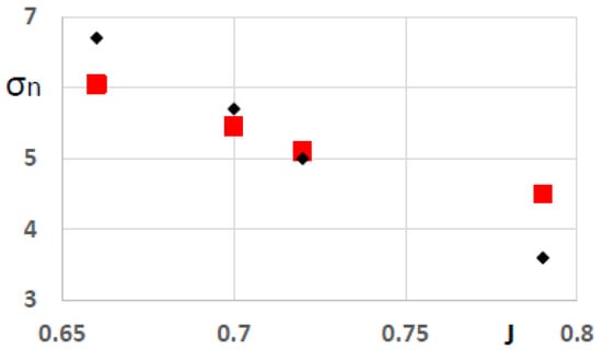 Measured dependencies σ(σV) (rhombs relate to α° = 8°, squares to α° = 12°) and σ calculated with Equation (11) for b = 0.003 (solid line) and b = 0.0045 (dashed line) for cavitating hydrofoil NACA4412.