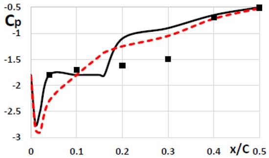 Comparison of pressure computed with MFTF and measured pressure over the suction side of the NACA 0015 hydrofoil. Squares—experiment; solid line—computations with an account of laminar boundary layer; dashed line—FLUENT solver for fully TBL; Re = 1,200,000; separation takes place at Re < 300,000.