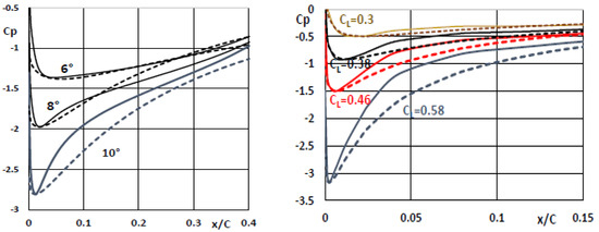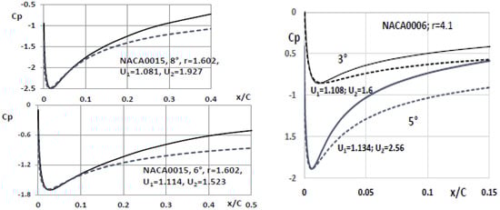 The differences between −min{Cp} and cavitation inception number can be represented by the function Dσ{δ, r, U1, U2}. This function would be seen as the universal correction (allowance) compatible with the various tools employed for cavitating-free hydrofoils and the rotating blade. The first step in verification of the possibility of such a correction is an evaluation of the difference between numerically determined and asymptotic pressure distributions for several hydrofoils. The most accurate verification of Equation (1) seems to be carried out using exact analytical solutions for 2D ideal fluid problems. However, as manifested about a century ago [41], the ideal fluid theory gives a much better agreement to the experimental data when the measured dependency of the lift coefficient CL on the angle of attack α° is used instead of the CL value found using the condition of Kutta–Joukovskii at the foil trailing edge. The comparisons in Figure 4 and Figure 5 cover ranges of {α°, δ, δc} for four hydrofoils. Selection of these hydrofoils was made because the detailed descriptions of the experiment on determination of cavitation inception numbers were published [2,42,43] for three of them. Therefore, the actual dependencies CL(α°, Re) are known (and consequently, the data from these hydrofoils will be useful for the further validation of the suggested computational technique).