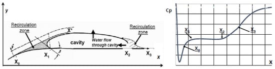 The second path is based on the models developed for fully turbulent flow (MFTF) of a homogeneous gas–liquid mixture. MFTF has been broadly employed after publications [10,11,12,13,14,15]. Diverse turbulence equations were used in these publications (and even diverse definitions of the mixture density). Moreover, there are no certain cavity surfaces in all versions of MFTF, whereas regions with a high void fraction are accepted as the cavities when the mixture pressure in such regions goes down to vapor pressure and may be considered as . The maximum of cavitation number calculated with its use are accepted as cavitation inception number. In the last two decades, computational studies of hydrofoil and propeller cavitation were carried out mainly using MFTF. Such studies relate to prediction of hydrofoil cavitation inception in particular [16,17,18]. Evaluations [19,20] of the results of MFTF for marine propellers by the recognized experts were skeptical a decade ago. Nevertheless, more recently there appeared quite successful numerical studies of propeller cavitation accomplished with this flow model [1,21,22,23,24,25,26]. Note that the studies [1,25,26] relate in particular to the vortex cavitation inception. Oppositely, prediction of blade cavitation inception using MFTF remains difficult. In particular, RANS computations of blade cavitation in [1,2] did not provide cavitation inception numbers at all. The main challenge is to accurately predict the flow characteristics near the blade leading edges, where blade cavitation starts. As manifested in [17] and illustrated in Figure 3, computational tools developed for fully turbulent flows inaccurately predict pressure in the vicinity of hydrofoil/blade leading edges, even in cavitation-free conditions. As one can understand from Figure 3, the real pressure along the separation zone is substantially different from predictions for fully turbulent flow; in that particular case |Cp| in this zone constitutes around 2/3|minCp| and around 0.8|Cp| in the point where laminar boundary layer separation criterion predict it without taking into account the viscous–inviscid interaction effects. Moreover, pressure in the appearing cavity would be very close to the pressure in the separation zone. Thus, analysis of cavitation-free flow cannot be suitable for prediction of cavitation inception, necessitating use of the multi-zone analysis therein. One may also recall that RANS solvers inaccurately describe velocity profiles inside the cavities, as is well illustrated in [27], but as was recently manifested in [28], the assumptions of the cavity content do not affect computations of pressure distributions (at least in steady inflows).