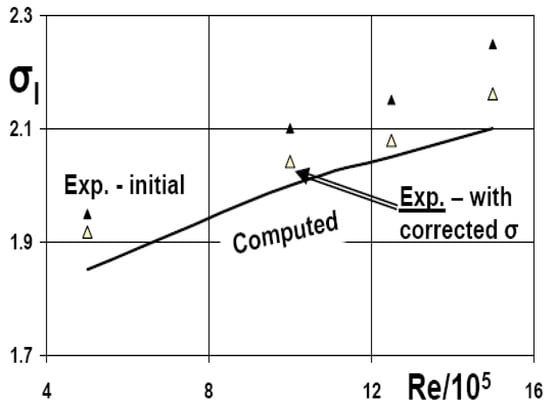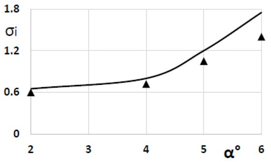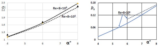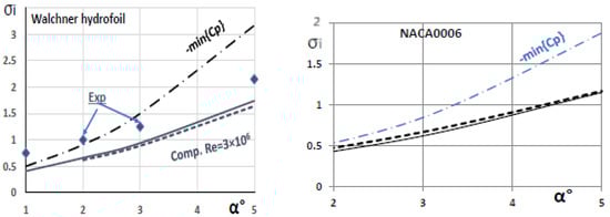 The values of Dσ gradually increased with the angle of attack, as one can see in Figure 10 for another thick hydrofoil. At a relatively small value of CL/δ (such as is inherent in NACA0015 at α = 4°), there were no sharp velocity maxima near leading edges, and cavitations appeared in the middle of the hydrofoil at cavitation numbers very close to |min{Cp}|. As one can see in Figure 4 and Figure 5, at the very small lift coefficients, the asymptotic looked nice, but there was no edge cavitation at such coefficients. Comparison of computational results with experimental data is not a trivial task. One may see that the experimental data in Figure 10 do not coincide with the values of vapor cavitation numbers reported in [42]. Note that these data were corrected using Equation (2) and the information on inflow air content from [42].