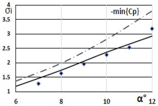 Cavitation inception versus angle of attack for NACA 4412 at Re = 9 × 105. Cp was numerically found for measured CL(α°); computed σi is the solid line; measured σi (rhombs) is corrected taking into account the inflow air content.