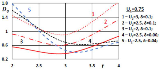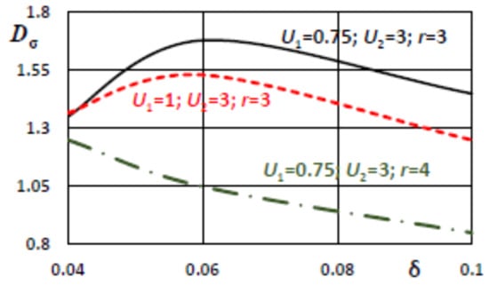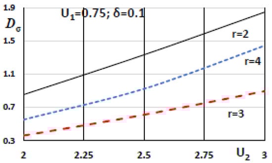 One can see in Figure 14 and Figure 15 that the correlation gradually increases with U2 for fixed r but has a minimum inside of the range of r variation. Such a minimum cannot be predicted simply from Equation (1). As seen in Figure 16, there is a maximum of correlation inside the interval of thickness variation. In addition, the correlation decreases with the increase of U1 and with other parameters of the asymptotic kept constant.