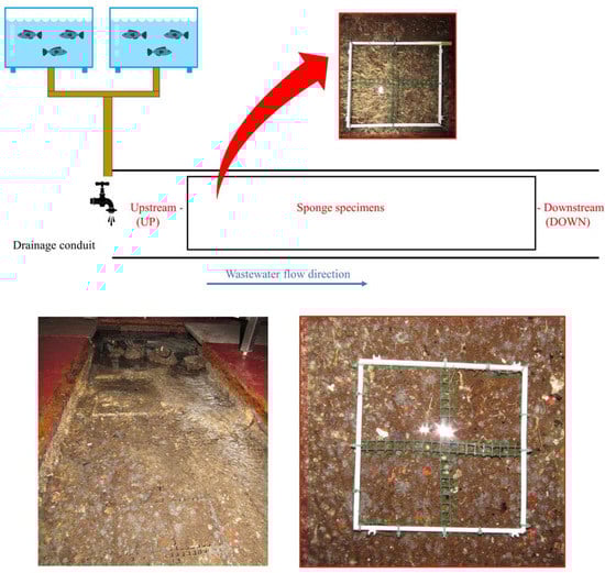 Schematic drawing (not in scale) and real picture of the wastewater drainage conduit where the sponge, Hymeniacidon perlevis, lives, as well as an indication of the wastewater collection points: upstream (UP) and downstream (DOWN). In the red box, picts of H. perlevis with a polyvinyl chloride (PVC) frames utilized for sponge volume measurement.