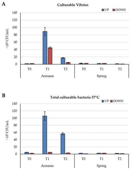 Culturable Vibrios (A) and total culturable bacteria at 37 °C (B) mean values ± standard errors in wastewater upstream (UP) and downstream (DOWN) of Hymeniacidon perlevis at each sampling time (T0, T1, T2) during both sampling periods (autumn and spring).