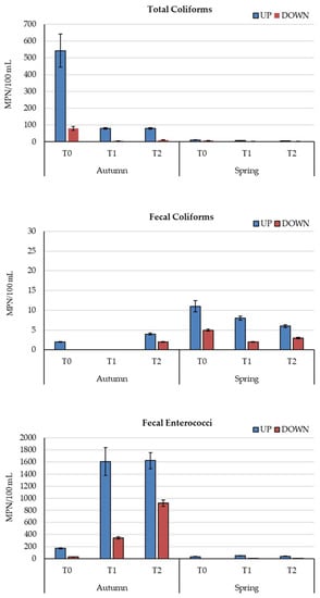 Fecal contamination indicators (mean values ± standard errors) in wastewater upstream (UP) and downstream (DOWN) of the sponge Hymeniacidon perlevis at each sampling time (T0, T1, T2) during both sampling periods (autumn and spring).