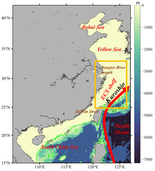 The East China Sea (ECS) is one of the largest marginal seas with significant sea–land interaction in the western Pacific (Figure 1). At the Yangtze River mouth, the isobaths of depth protrude outward in an arc. The distribution of hydrologic factors (temperature, salinity, etc.) in the ECS is affected by evaporation, precipitation, circulating currents, and also by the runoff from the Yangtze River into the sea. Previous research has shown that high-salinity water is located in the mid-shelf with less saline water in the inner shelf, forming a gradient parallel to the coast [1]. The ECS water mass is affected by the Yellow Sea circulation in the north, and the Kuroshio and its tributaries, which are manifested as a saline intrusion along with the warm water from the Taiwan Strait in the south. The mixture of the currents in the south is known as the Taiwan Warm Current [2,3,4]. At the same time, the Yangtze River enters the sea, extends eastward on the surface, and forms a new type of water by mixing with saline ambient water in the ECS shelf [5]. Overall, the distribution and properties of water mass in the ECS shelf are affected by these complex currents [6]. The ECS water mass has attracted extensive attention and there has been lots of research with slightly distinct results [7,8].