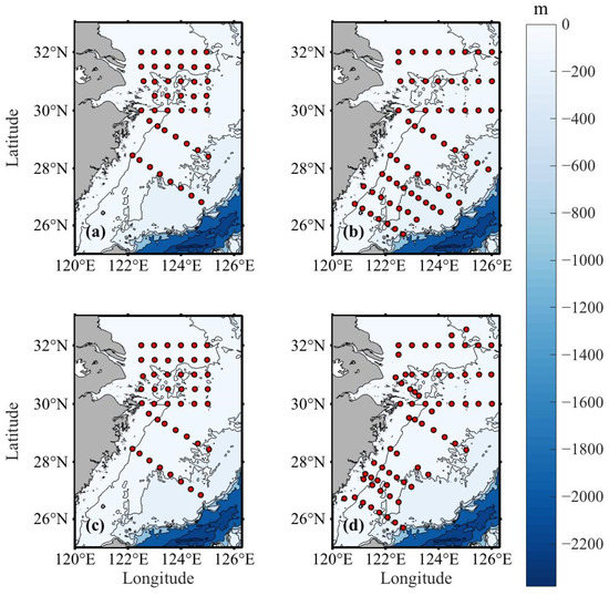 Processed cruises station distributions in the ECS shelf. The red dots show the locations of stations, and the black lines present the −50 m, −100 m, −200 m, −500 m, −1000 m, and −2000 m isobaths. (a) Summer (June) 2010; (b) Summer (June) 2011; (c) Autumn (November) 2010; and (d) Autumn (October) 2011.