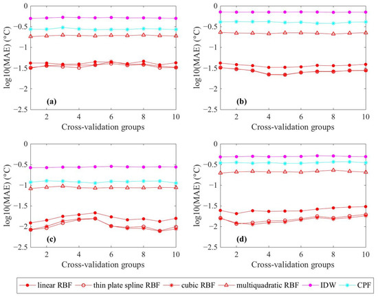 The log10(MAE) of each method in the 10-fold cross-validation experiments for temperature interpolation. (a) Summer 2010; (b) Summer 2011; (c) Autumn 2010; and (d) Autumn 2011.