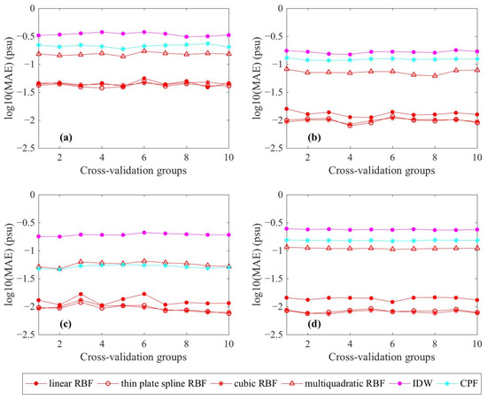 The log10(MAE) of each method in the 10-fold cross-validation experiments for salinity interpolation. (a) Summer 2010; (b) Summer 2011; (c) Autumn 2010; and (d) Autumn 2011.