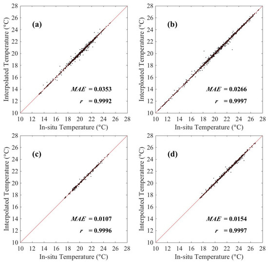 Scatterplots of the matchups between the interpolated and in situ temperature. The red line is the 1:1 line and is the correlation coefficient. (a) Summer 2010; (b) Summer 2011; (c) Autumn 2010; and (d) Autumn 2011.