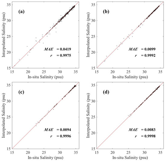The scatterplots of the matchups between the interpolated and in situ values (all the interpolations at the positions of in situ observations in 10 test groups are considered) are presented in Figure 5 and Figure 6. Generally, most points are close to the 1:1 line for the entire ECS shelf and the bias calculated following Equation (9) (where is the total number of the matchups) is on the order of ~10−4 for all situations. Quantitatively, the correlation coefficients and MAE show that the RBF reconstructions have a good agreement with the in situ data in all conditions. The MAEs of all 10 test groups are in the order of ~10−2 in Figure 5 for all the conditions while the interpolated results in summer are slightly worse. The same condition occurs in salinity interpolation. The MAEs of all the in situ observations are smaller than the order of 10−2 except that in summer 2010 (Figure 6a), with MAE equaling to 0.0419 psu. It is noticed that the larger biases are mostly distributed in the area with a low salinity, which is near the Yangtze River mouth through the matchups in Figure 6a,b. It implies that the gradient distributions of the target values possibly have an essential impact on the interpolated results.