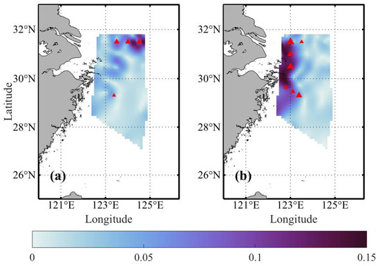Schematic diagram of the gradient norm distribution of the interpolation results with the thin plate spline RBF method at −5 m depth in summer 2010 (the unit are and for (a) and (b), respectively). The red triangles present the locations of the observations at −5 m depth where there is an absolute error larger than 0.1 (°C or psu) in the random 10-fold cross-validation experiments, and its size reflects the size of the error. (a) Temperature; (b) Salinity.