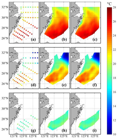 The in situ temperature (summer 2011) and results reconstructed with different RBFs in the ECS shelf. The first column presents the in situ observations, the second is the interpolation result using the thin plate spline RBF method, and the last column uses the cubic RBF method. (a–c) −5 m depth; (d–f) −45 m depth; and (g–i) −85 m depth.