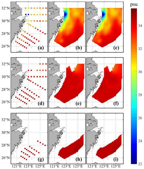 The in situ salinity (summer 2011) and reconstructed results with different RBFs in the ECS shelf. The first column presents the original in situ observations, the second is the interpolation result using the thin plate spline RBF method, and the last column uses the cubic RBF method. (a–c) −5 m depth; (d–f) –45 m depth; and (g–i) −85 m depth.