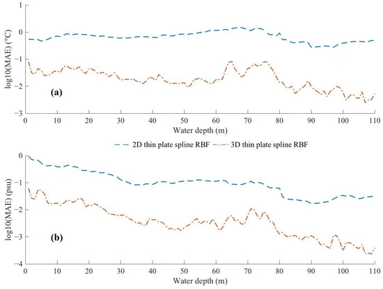 The log10(MAE) at different depths with 2D and 3D thin plate spline RBF methods, respectively. The blue dash-dot line is the 2D thin plate spline RBF method while the orange dash-dot line is the 3D thin plate spline RBF method. (a) Temperature, (b) Salinity.