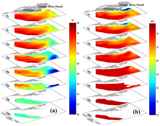 The 3D reconstruction of the in situ observations in summer 2011. (a) Temperature; (b) Salinity.