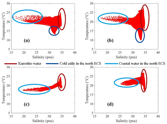 To check the reconstruction results, we present T-S diagrams during the four cruises (Figure 12) to show various water masses. Similar to Figure 11, the T-S diagrams can clearly show the high salinity water from Kuroshio, which includes high temperature Kuroshio surface water and lower temperature Kuroshio subsurface water [7]. Coastal water in the north ECS including Yangtze River plume and Zhejiang upwelling water can also be identified in summer (Figure 12a,b). The coastal water cooling in autumn (Figure 12c,d) is significant compared with that in summer due to the air temperature falling and enhanced mixing driven by strong wind. The cold eddy in the north ECS is a phenomenon that can only be observed in summer and can be easily found in our reconstruction results.