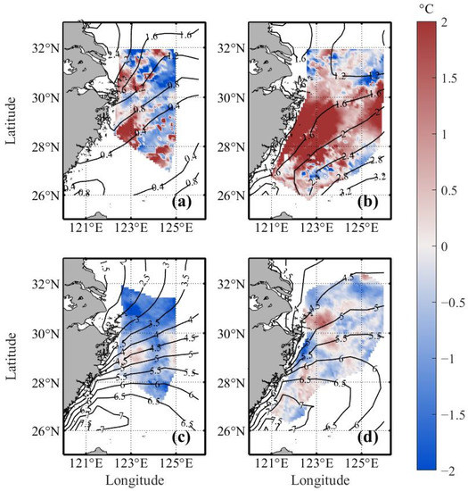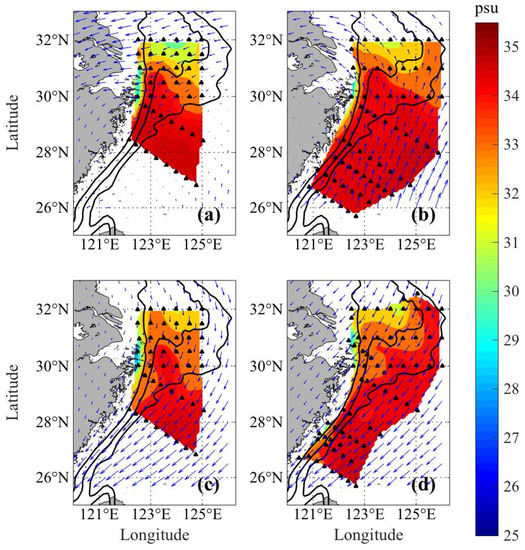 An important current in the ECS is the intrusion of the KBCNT at the bottom layer, which can affect the water mass near the Yangtze River mouth and southwest of the Yellow Sea [1]. To check the RBF reconstruction results, we showed the distribution of bottom salinity in Figure 13, because the temperature is easily influenced by solar heating at the surface. In summer (Figure 13a), the east wind was prevailing near the Yangtze River mouth, which hindered the north intrusion of the KBCNT on the bottom because the east wind induces northward transport in the surface and thus the southward transport on the bottom. In summer (Figure 13b), the high salinity KBCNT was close to the Zhejiang coast, which may be due to the offshore Ekman transport on the surface by the south wind and onshore transport as a compensation. With the similar mechanisms to that in summer, the bottom KBCNT intrudes offshore in winter (Figure 13c,d). The high salinity tongue can intrude further north to the southwest of the Yellow Sea, because of the barotropic adjustment as described in [1]. Compared with the result in [8], using regular Cressman interpolation, this result can show more details of the intrusion process of the KBCNT and can help further explore the observation data.