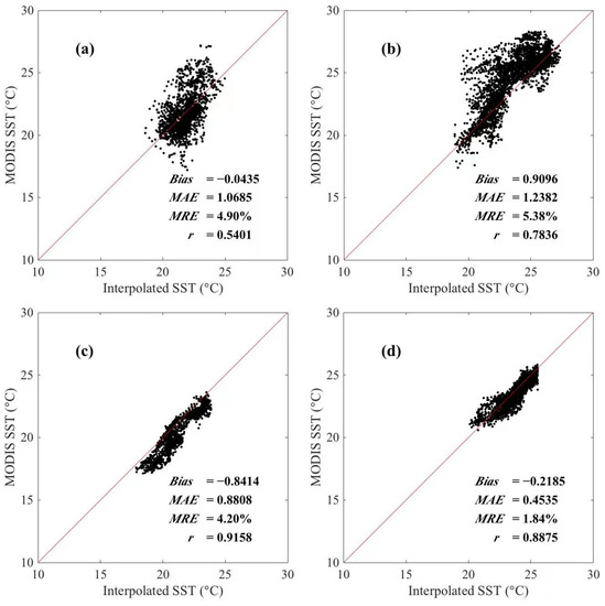Scattered plots of the match-up pairs between the interpolated SST and satellite-derived SST. (a) Summer 2010; (b) Summer 2011; (c) Autumn 2010; and (d) Autumn 2011.