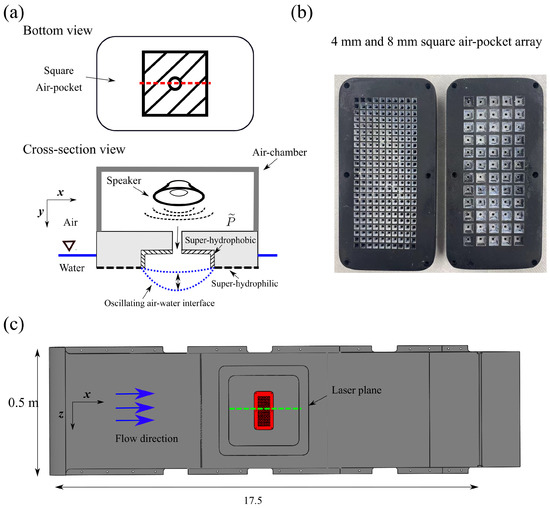 Figure 1a. First, a square-shaped surface cavity at the millimeter scale is created as an air pocket; the inner surface of the cavity is coated with a super-hydrophobic material, whereas the flat outer surface is coated with a super-hydrophilic material. This design ensures that when the surface is immersed in water, an air–water interface forms over the surface cavity, with its contact line pinned at the cavity edge. The oscillation of the interface is actuated by a dynamic pressure source (e.g., a speaker) located within a sealed air chamber. This design allows for the control of the dynamic oscillation as well as the static configuration of the interface. The curvature of the interface can be maintained either flush to the flat wall surface or bulging out of the air pockets into the TBL; this can be achieved by adjusting the static pressure inside the air chamber. In addition to the active oscillation, the interface also oscillates passively due to its interaction with the TBL. The dynamic free-slip surface method has several merits. First, its power input is low—at the level of overcoming the surface tension effect of the millimeter-sized air–water interface. Second, quick air replenishment can be realized through the air-chamber design in the case of air loss for any number of reasons. Third, it can be easily scaled up to cover a large surface area due to its simple design. More details of the dynamic free-slip surface can be found in [