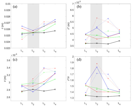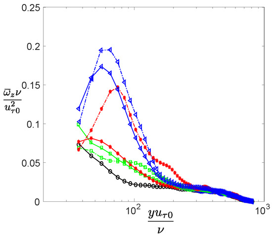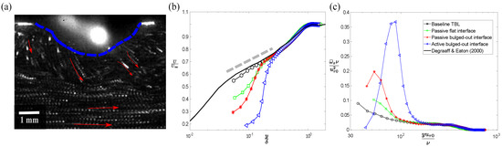 The effect of the oscillating interface on the TBL can be quantified by the non-dimensional Weber number , which depicts the relative significance of the inertia force versus the surface tension effect. The expression of the Weber number is , where is the density of water, l is the characteristic length, is the characteristic velocity, and is the surface tension effect. Many factors affect the value of . For example, is large when the interfaces have a large geometric size and a bulged-out configuration; this is because the surface tension effect is weaker, whereas the inertia force of the TBL is stronger. In addition, the presence of active oscillation enhances the effective size of the interface and therefore increases .