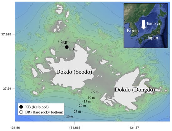 - Park, S.K.; Lee, J.R.; Heo, J.S.; An, D.S.; Lee, H.P.; Choi, H.G. Marine algae flora and ecological role of Eisenia bicyclis in Dokdo, East Sea, Korea. Korean J. Environ. Ecol. 2014, 28, 613–626. (In Korean) [Google Scholar] [CrossRef]