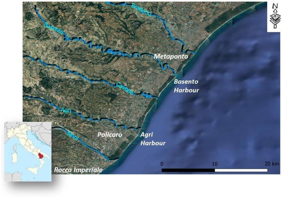 - Vita, M.; Bulfaro, M.; Cavuoti, C.; Pagliaro, S. Interazione Bacino-Costa: Cause e mitigazione della vulnerabilità. Il caso del littorale Jonico Lucano. In Proceedings of the Atti del Convegno: Coste Prevenire, Programmare, Pianificare. Collana dell’Autorità Interregionale di Bacino della Basilicata, Seconda Serie Editoriale, Maratea, Italy, 15–17 May 2008; pp. 29–44. [Google Scholar]