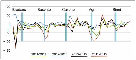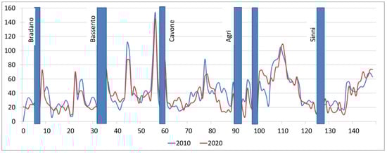The study area, oriented NNE-SSW, is located along the Ionian littoral of the Basilicata Region (Italy). The coastline is interrupted by five rivers: Bradano, Basento, Cavone, Agri and Sinni (Figure 1). Several dams and barrages, built since the end of the 1950s, have strongly reduced the sediment transport into the sea [25]. Indeed, before the 1960s, the mean discharge of the Bradano river was about 10.5 m3/s, with an annual suspended load of about 3.5 million tons [26]. After the construction of the S. Giuliano dyke in 1956, the mean discharge reduced to 2.5 m3/s and the suspended load reduced to 271,000 tons. The extraction of sand and pebble from the riverbeds had also contributed to the reduction of the fluvial discharge [25]. For instance, 5 × 106 m3 of material were extracted from the Bradano river between 1965 and 1977, and almost 8 × 106 m3 were extracted from the Basento [26].