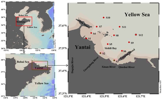 Sishili Bay (37.42–37.63° N, 120.35–120.63° E), semi-enclosed by Yantai, covers an area of 130 km2 with a 20 km long coastline. The average water depth is about 8–10 m. It is an important harbor in Northern China and provides the local seafood supply. Several rivers flow into Sishili Bay, including the Dagujia River, Guangdong River, Xin’an River, and Qinshui River. These rivers carry large amounts of nutrients and pollutants into the bay, influencing seawater quality and further affecting phytoplankton growth [].