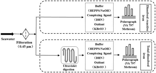 The iron speciation was determined using CSV [,]. Figure 2 shows a flow chart for determining the different species of iron in seawater. The concentration of dissolved reactive iron (DrFe) includes all dissolved inorganic iron (II and III) and part of the organically complexed iron, while that of TdFe includes all dissolved inorganic and organic iron []. DrFe was determined by adding 10 mL filtered seawater sample without pretreatment to a quartz voltammetric cell with 100 μL of a 1 M HEPPS/0.5 M NaOH buffer solution (keeping the pH value of the determination system at about 8.0). Following this, 10 μL of 20 mM DHN and 500 μL of 0.4 M KBrO3 were sequentially added. The electrochemical detection experiment was performed after 5 min of oxygen removal using high purity nitrogen. The concentrations of DrFe in seawater were measured using a standard addition method [,,], and a graphical representation of titration was shown in Figure S3. As compared, the detection process of TdFe was similar to the process used to detect DrFe, except that filtered samples were digested for 90 min at pH 2 under a high-pressure mercury vapor lamp to destroy the complexes and compounds prior to analysis [].
