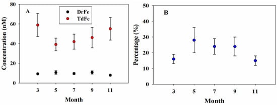 Table 2 lists the average levels and the range of different species of iron over the five monitoring months in 2018. TdFe levels provided by our previous work ranged from 27.8 to 82.0 nM with decreasing values in March, November, September, July, and May [], and DrFe content ranged from 6.8 to 13.3 nM with decreasing values in September, May, July, March, and November, the proportion of DrFe to TdFe ranging from 10.4% to 47.7%. As shown in Figure 3A,B and Figure 4, DrFe changed little, while the variation trend of TdFe was opposite to and the proportion of DrFe to TdFe. It could be concluded that DrFe content in 2018 was relatively stable compared to that of TdFe.