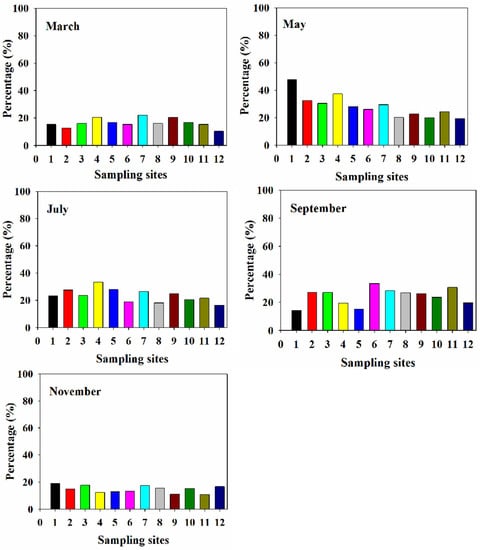 Table 1 provides the typical average values of T, DO, Cond, SAL, pH, and Chl a for the seawater samples in Sishili Bay in 2018. The results showed that there were seasonal variations in T, DO, and Chl a. However, the Cond, SAL, and pH values exhibited little difference over five months. The average T was highest in July, with sequentially decreasing values in September, May, November, and March. The Chl a levels were highest in September, with sequentially decreasing values in July, May, November, and March. This change order was generally consistent with that of T. However, the DO levels were almost on the contrary order. These levels were highest in March, with sequentially decreasing values in May, November, July, and September. In summary, T was in the same variation trend with Chl a and was in the opposite trend with DO. These results were generally consistent with previous studies [,], which may be because as the T increased, phytoplankton grew more vigorously, and the solubility of DO decreased. The temporal and spatial distribution of Chl a and the correlation between DrFe and physicochemical parameters are given in the supporting manuscript [,,].