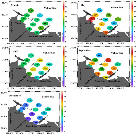 Since this study mainly focused on DrFe, the spatial and temporal distribution of TdFe is not discussed in detail. The spatial distribution of DrFe is shown in Figure 5. DrFe contents varied little at different sampling sites in the same month, especially in March, July, and November, with a concentration range of 8.5–10.2 nM, 8.6–11.2 nM, and 6.8–8.8 nM, respectively. DrFe contents varied slightly more within the month in May and September than in the other three months, with a concentration range of 8.3–13.3 nM and 8.1–12.6 nM, respectively. The highest DrFe concentrations at sites S1, S3, and S4 were detected in May, at levels of 13.3 nM, 12.4 nM, and 12.8 nM, respectively. The highest DrFe concentrations at sites S2, S6, and S11 were detected in September, at levels of 12.2 nM, 12.5 nM, and 12.6 nM.