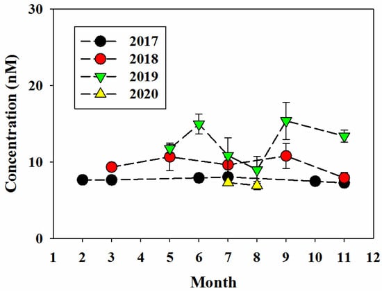 To test this preliminary conclusion, the concentrations of DrFe in 2017, 2019, and 2020 were also measured (Figure 6). During these years, it ranged from 6.7 to 9.2 nM, 6.8–17.6 nM, and 6.3–8.0 nM, respectively; this indicates that DrFe was relatively stable except in 2019, which may be related to the test method and environment at that time. From this study, it can be reached that DrFe in coastal water can remain stable, though further study is needed to validate this observation.