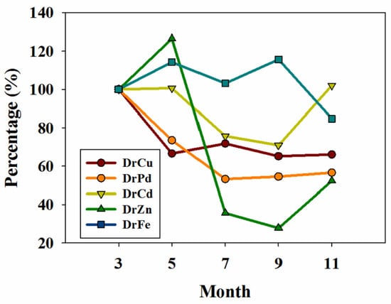The concentration trends of dissolved reactive Cu, Pb, Cd, Zn, and Fe (DrCu, DrPb, DrCd, DrZn, DrFe) in Sishili Bay in 2018. Percentage values indicate the change in the metal concentrations in other months compared with the first months (where the first month’s concentration is set equal to 100%) [].