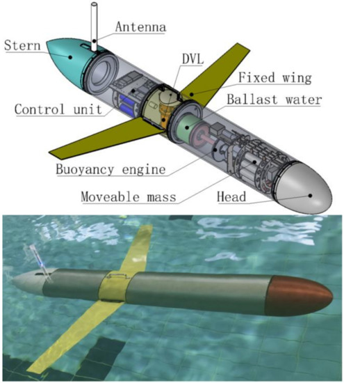 A torpedo-like glider is displayed in Figure 1 [16]. The glider is categorized into the head, middle, and tail parts. The middle part consists of several parts, including the movable mass block, buoyancy engine, fixed wing, and control unit. The glider pitch attitude and net buoyancy can be changed by adjusting the position of the movable mass block and moving the piston in the buoyancy engine, respectively. Adjusting the glider buoyancy can enable the glider to sink underwater or float.
