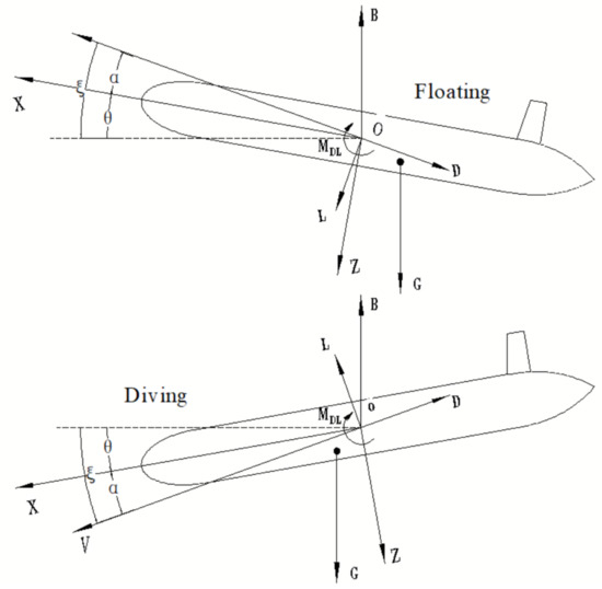 The UG reaches a state of force equilibrium in steady-state gliding because of the interaction of hydrodynamic forces, gravity, and buoyancy forces during underwater diving and surfacing. As displayed in Figure 3, if the point of action of lift L is located behind the buoyancy center (-x-axis direction), then the moment of the lift and gravity (G) relative to the buoyancy center around the y-axis is in the same direction during the dive and surfacing phases. By contrast, if the point of action of lift L is located in the front of the buoyancy center (+x-axis direction), then the moment of lift and gravity relative to the buoyancy center around the y-axis is in the opposite direction. Figure 3 illustrates the forces of the glider in the steady-state diving and surfacing.