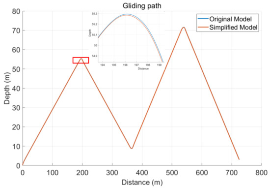 The simulation results for the glide path of both models were almost identical for the same inputs, and the simplified model achieved the same functionality as the original mathematical model. A comparison of the simulation results is displayed in Figure 4.