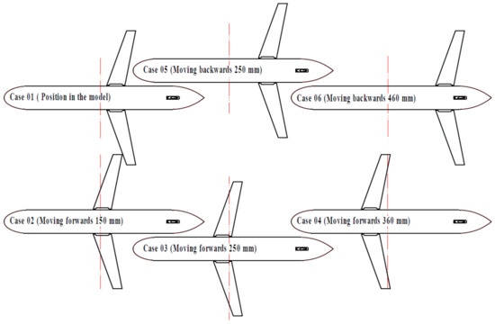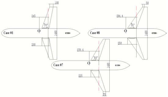 In Cases (Figure 6) 01, 07, and 08, the wingspan and surface area of the airfoil were maintained constant at various wing sweep angles, and these fixed wings with different airfoil parameters were mounted in the same position, as displayed in Figure 6. The dashed red line indicates the position of the point of action of the wing lift in the x-axis direction of the body coordinates. The distances from the floating center to the point of action of the force were 245, 270.6, and 294.4 mm in Cases 01, 07, and 08, respectively.
