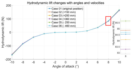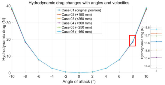 The simulation speed conditions were set from 0.25 to 1.5 m/s, with an interval of 0.25 m/s. Based on Equations (31)–(33), the results of the hydrodynamic lift, hydrodynamic drag, and hydrodynamic moment for Cases 01–06 under various AOAs are displayed in Figure 7, Figure 8 and Figure 9. The red box represents the local zoomed-in area. Figure 7 and Figure 8 indicate that for all six cases of the position of the fixed wing relative to the buoyancy center in the glider assembly, the hydrodynamic lift and drag remained approximately the same within the AOA range (−8° to 8°) and within the cruising speed range of less than 1 m/s. The variation in the hydrodynamic moment, displayed in Figure 9, is evident.