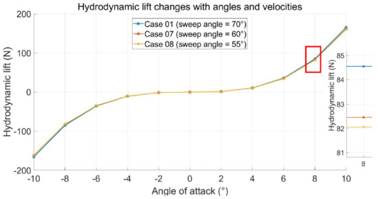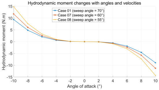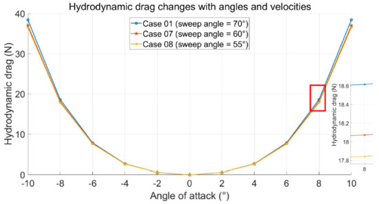 For various AOA and velocity conditions based on Equations (31)–(33), the results of the hydrodynamic lift, hydrodynamic drag, and hydrodynamic moment for Cases 01, 07, and 08 are displayed in Figure 10, Figure 11 and Figure 12. The red box indicates the local zoom area. Figure 10 and Figure 11 display that the hydrodynamic lift and drag are similar in the AOA range (−8° to 8°) and cruising speed less than 1 m/s, whereas the variation in the hydrodynamic moment is significant, as displayed in Figure 12. These results revealed that the hydrodynamic lift and drag decreased when the sweep angle decreased. However, the change in the airfoil shape caused the geometric center of the fixed wing to move away from the buoyancy center, which resulted in a tendency for the hydrodynamic moment to increase.