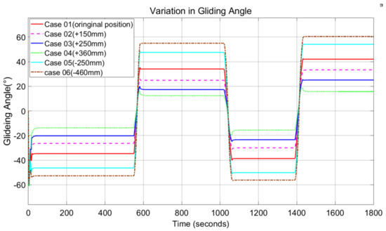 When the glider is moving underwater in a steady state at a speed of 0.4 m/s, the gliding angle is + or −25°. Here, +25° indicates that the glider is in the surfacing stage; otherwise, it is in the diving stage. As presented in Table 4, the movable mass block in Case 06 exhibited the smallest moving displacement when the glide paths of the gliders were the same.