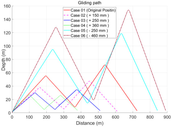 In Figure 13, Case 06 exhibits the fastest gliding speed for the same input conditions, and the comparison results of the gliding angle in Figure 14 reveal that the glider in Case 06 exhibits a larger range of gliding angles than those in other cases. Compared with the glide trajectory, the glider in Case 06 exhibited a larger dive depth and glide distance when the inputs were the same for all cases.