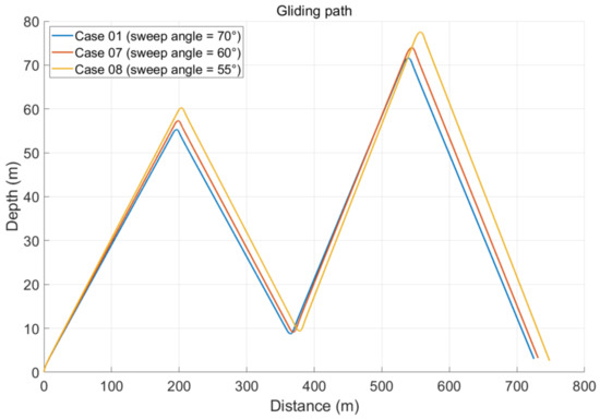 Figure 16 displays a comparison of the glide paths of the three cases (Cases 01, 07, and 08). According to the results, the glide path exhibited an increasing trend as the sweeping angle decreased.