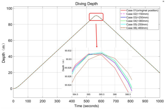 Figure 17 shows the comparison of the glide depth of the glider in the stable gliding condition, and the control inputs are the parameters in Table 4. Considering the transformation of the glider from steady-state dive to steady-state surfacing, the displacements of the mass block and piston for each case were obtained from Table 4. The displacement of the piston and dive depth were approximately equal in each case, and the work required to overcome the seawater pressure was approximately the same for the same buoyancy engine mechanism. The work performed by the mass shifter on the mass block in the glider is expressed as follows: