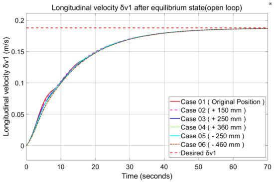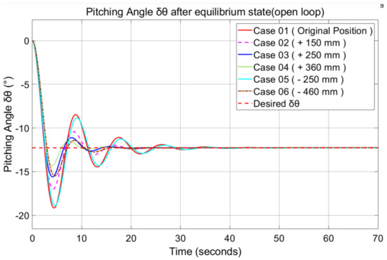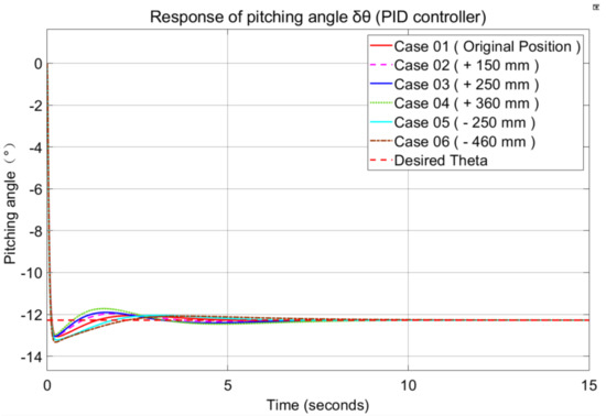 Figure 18, Figure 19, Figure 20 and Figure 21 display the simulation results for the open- and closed-loop for Cases 01–06, Figure 18 and Figure 19 detail the responses of the pitch angle () and longitudinal velocity () after setting a target and assigning inputs to individual cases. All cases eventually reach a steady state, and Case 04 is the first to reach the steady state. Figure 20 and Figure 21 illustrate the response states of the aforementioned angle and velocity under the action of a proportional–integral–derivate (PID) controller. Figure 20 displays the pitch angle () response for a disturbance, and the response trend was similar for all cases. The figure reveals that the controller can control the transient mode resulting from disturbances. Furthermore, the results in Figure 20 and Figure 21 represent that the position of the fixed wing did not affect the glider control response. Because of the approximate symmetry of the dive and surfacing, control simulations were performed only for the dive phase.